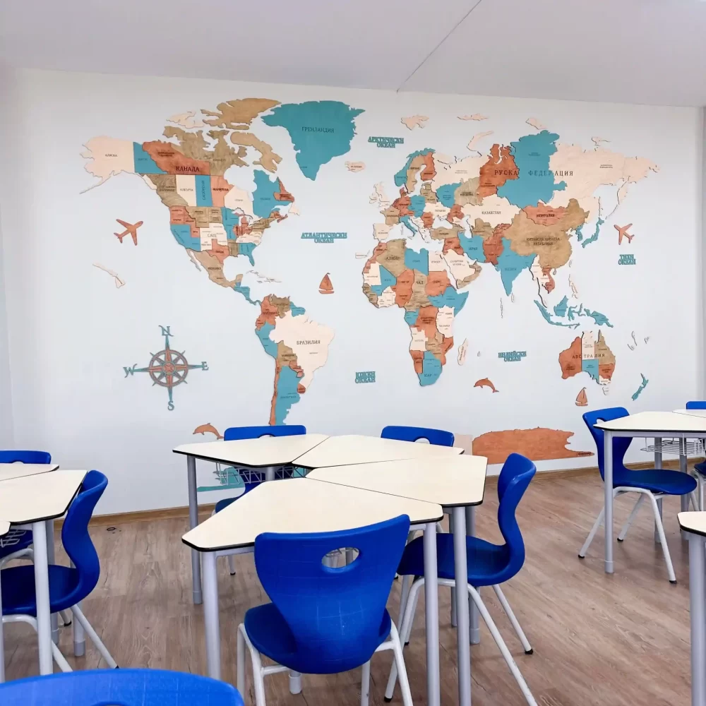 На първата снимка е най-голямата дървена 3D карта на света, създавана до момента: 450х275 см по индивидуална поръчка на една от водещите авиокомпании в света. Естествено в цветовете на техния бранд. Година по-късно имахме възможност да изработим светеща карта в този размер за българско училище.