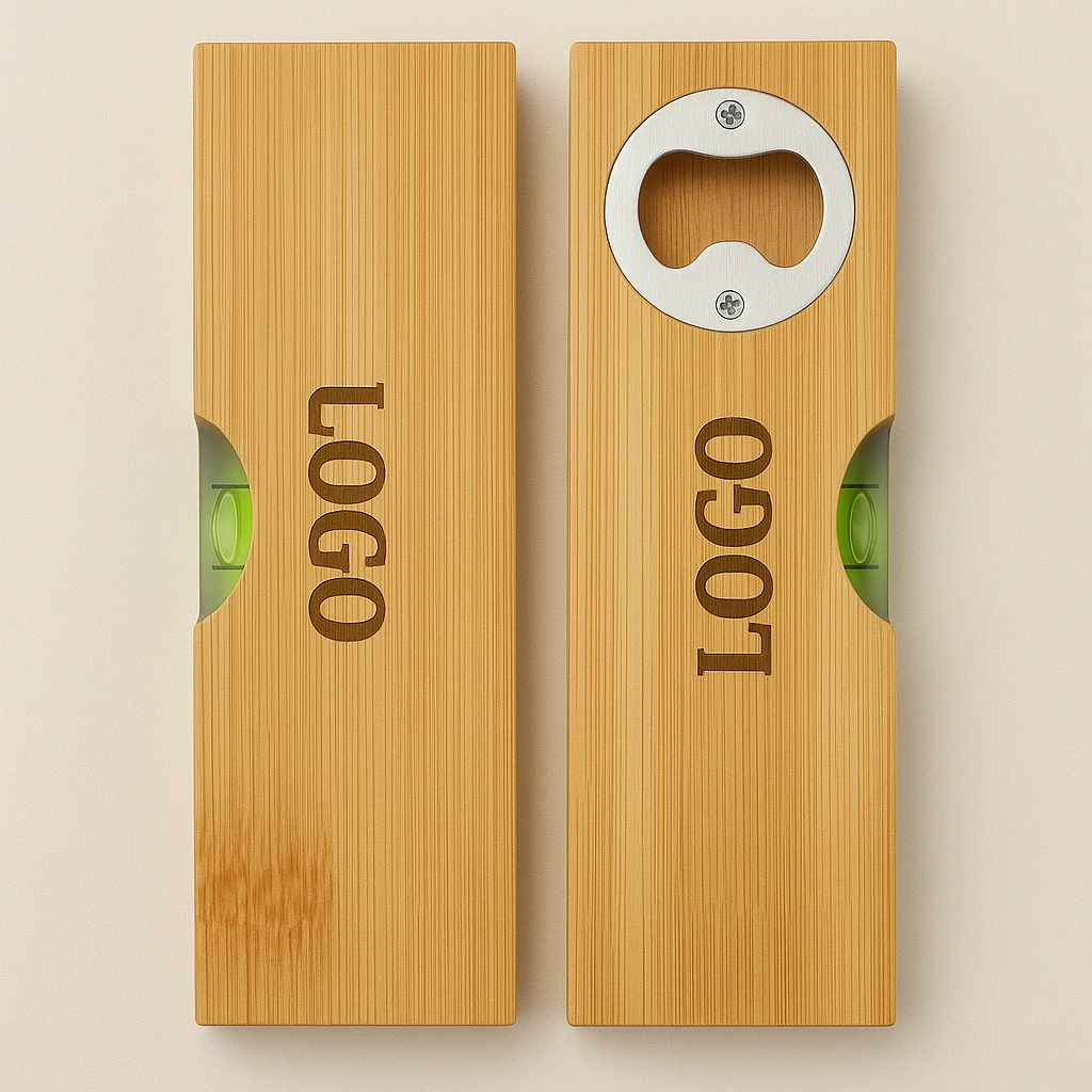 Стилна и практична бамбукова отварачка за бутилки, комбинирана с нивелир за още по-оригинален акцент. Изработена от екологичен бамбук с метален елемент за отваряне, тя е едновременно функционален инструмент и впечатляващ корпоративен подарък. Възможност за лазерно гравиране на лого, инициали или послание върху дървената част.