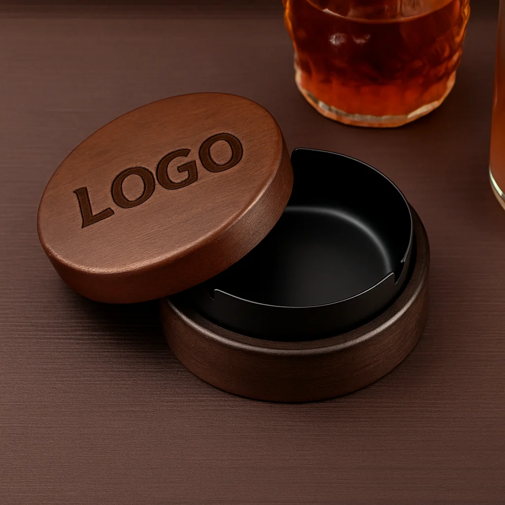 Елегантен пепелник с дървен капак и основа, комбинирани с черна метална вътрешна част за лесно почистване и издръжливост. Капакът позволява лазерно гравиране на лого или инициали, което придава премиум излъчване. Подходящ за барове, офиси, корпоративни подаръци или лична употреба.