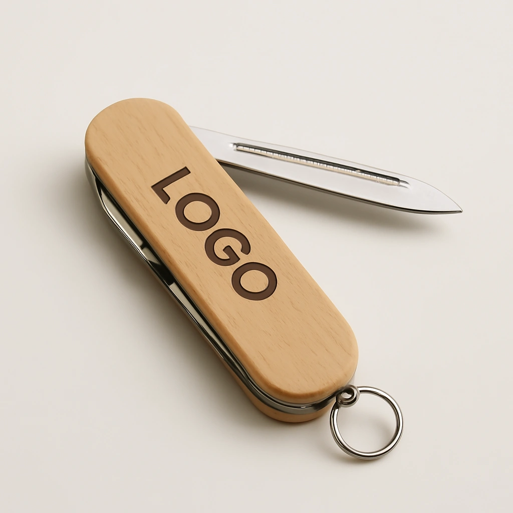 Практичен и стилен джобен нож с дървена дръжка и метални инструменти. Компактен и удобен за носене, той съчетава елегантен дизайн с функционалност. Персонализира се с вашето лого или надпис, което го прави чудесен корпоративен подарък или промоционален артикул.