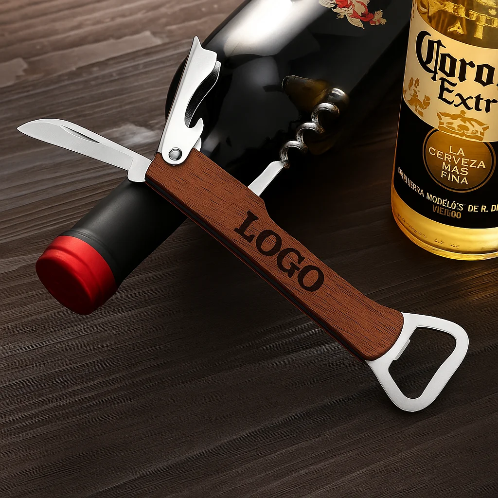 Практичен мултифункционален нож с елегантна дървена дръжка, включващ отварачка за бутилки, тирбушон и сгъваемо ножче. Изработен от висококачествена стомана и дърво, този аксесоар е идеален за подарък, както и за ежедневна употреба. Дръжката позволява лазерно гравиране на лого или инициали, което го прави отличен избор за корпоративни клиенти или специални поводи.